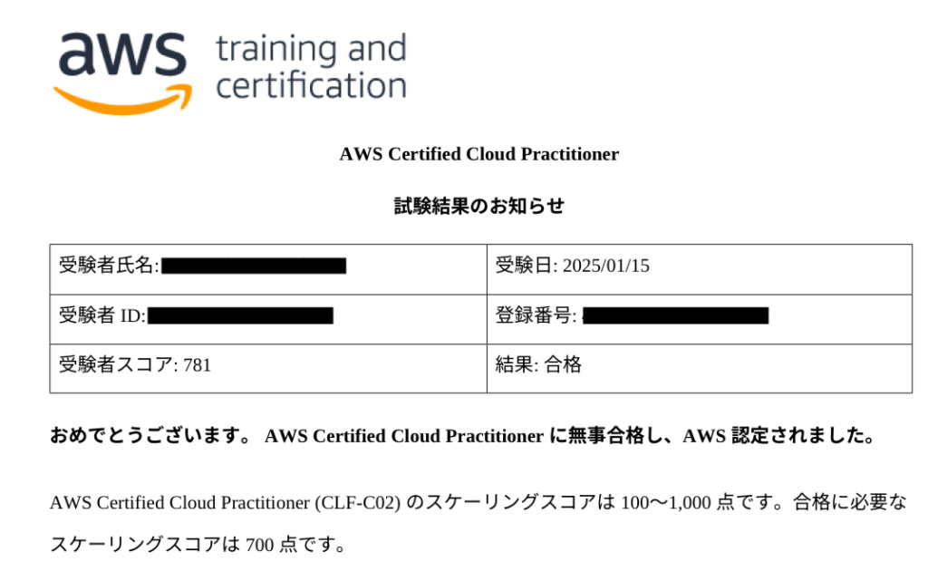 2025/01/15、AWSクラウドプラクティショナーを受験し、無事に合格できました。