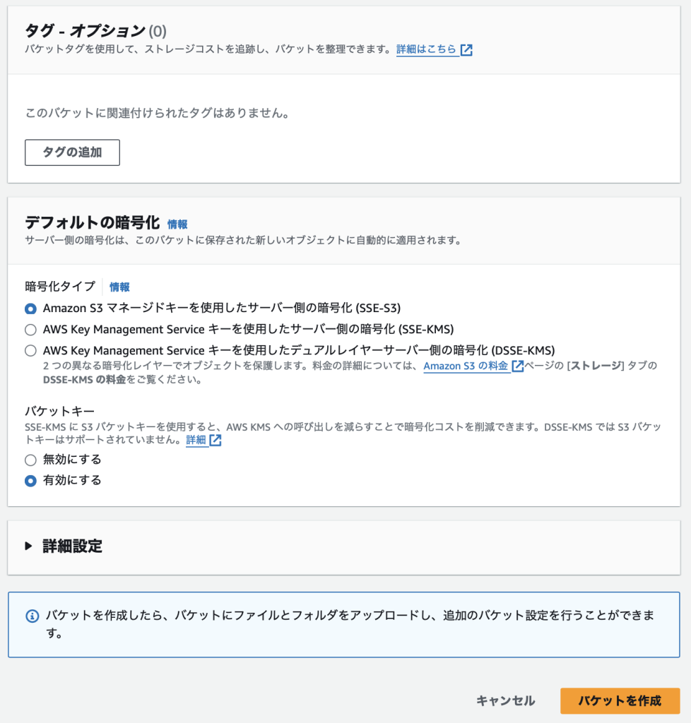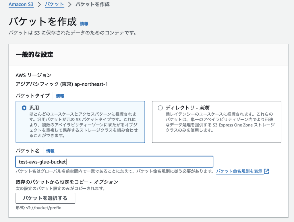 今回の検証用のファイルを格納しておくS3バケットを作成しておきます。