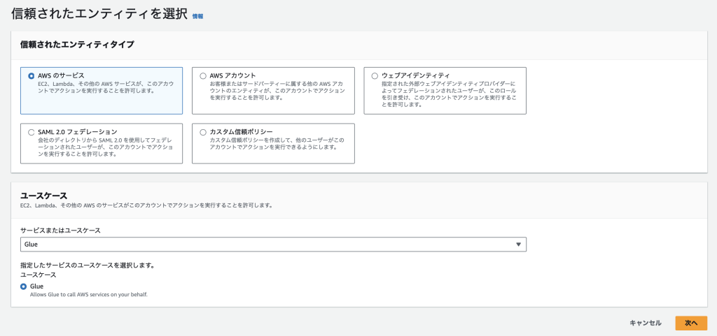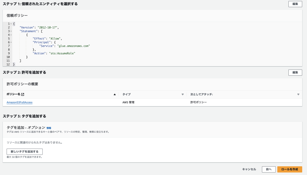 AWS Glueのスクリプトに設定するIAMロールと、データソースとなるS3のバケットを作成しておきます。