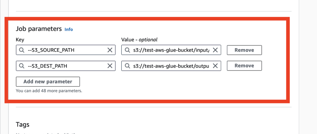 args = getResolvedOptions(sys.argv, ['JOB_NAME', 'S3_SOURCE_PATH', 'S3_DEST_PATH'])ここで受け取るパラメータは「job details」タブから設定することができます。