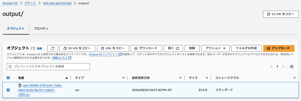 S3のoutputフォルダを見ると、33Bのファイルが一つ作成されています。