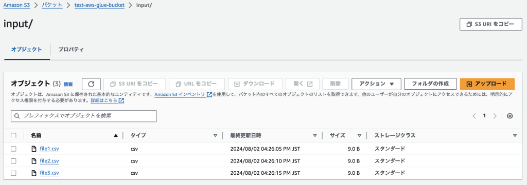 テスト用にS3のinputフォルダに9Bのファイルを3つ格納しておきます。