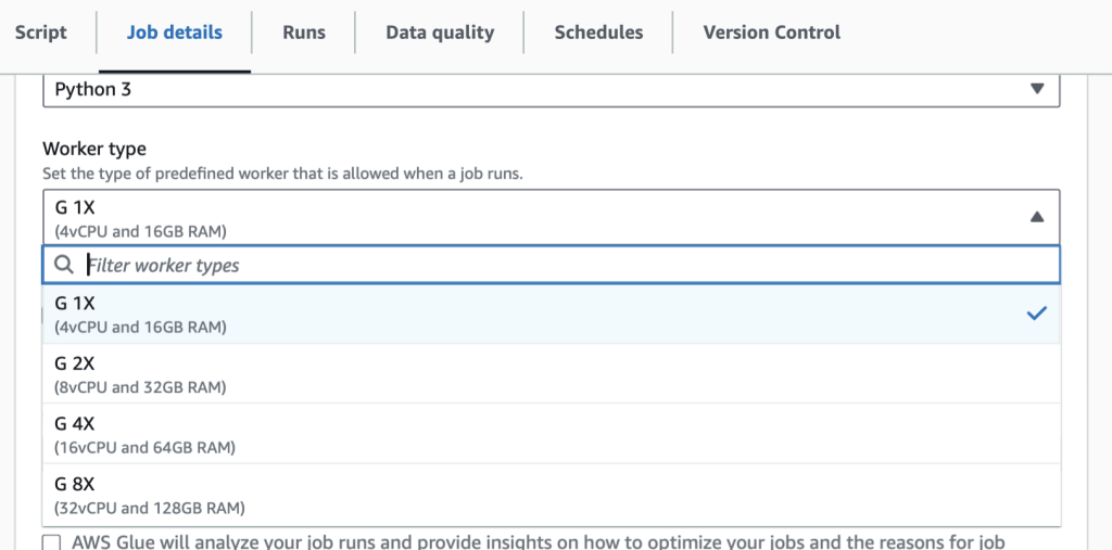また、Glueを実行するインスタンスのスペックを変更することができるため、処理に応じて適切なスペックに設定することが可能です。