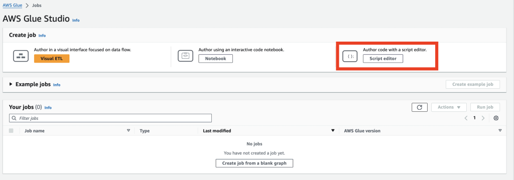 クリック後、以下のようにスクリプトを記述するエディタが表示されます。AWS GlueのスクリプトはPythonで記述します。