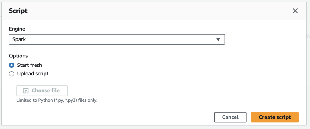 「Engin」に「Spark」を選択し、「Create script」をクリック。