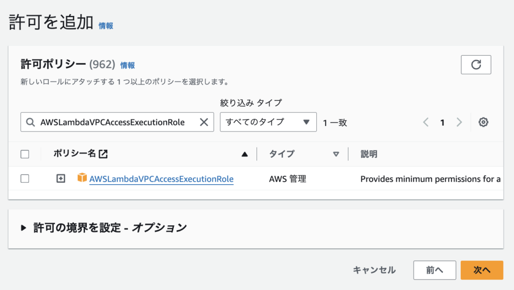 上の編集ボタンを押して「AWSLambdaVPCAccessExecutionRole」を追加します。