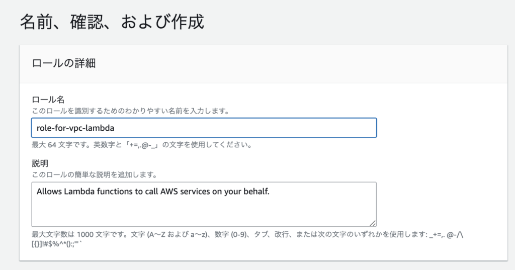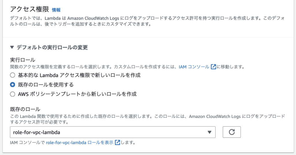 「実行ロール」に、ここまでで作成したVPCとS3の操作が許可されたIAMロールを設定します。