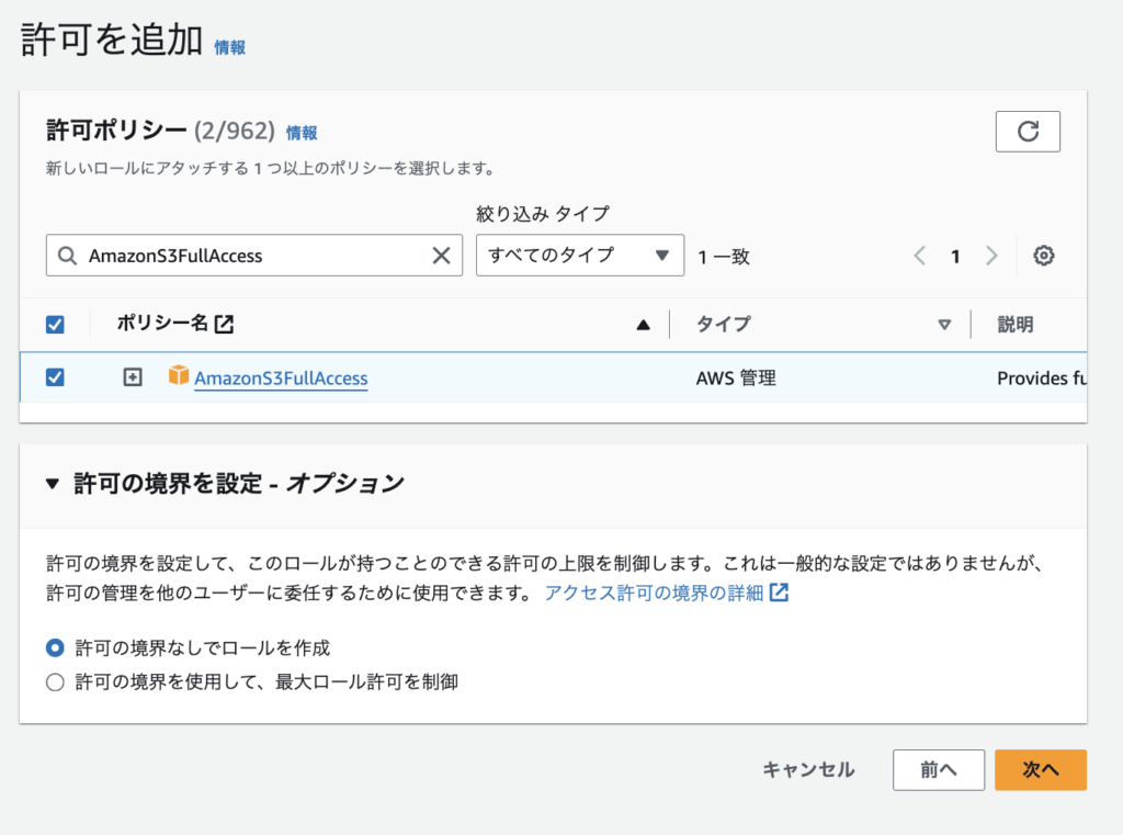 今回は検証なので「AmazonS3FullAccess」を設定しました。