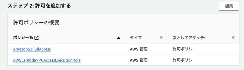今回作成するラムダでは、S3にファイルを書き込むのでS3へのアクセス許可も追加します。