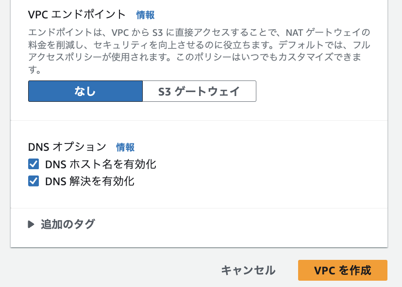 今回はすでにあるVPCに対して設定する手順も解説したいため、ここでは「なし」を選択して作ります。