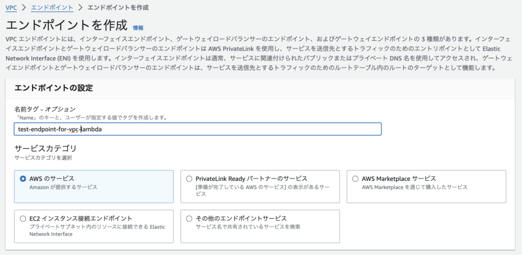 今回の検証では、「ゲートウェイエンドポイント」を利用します。