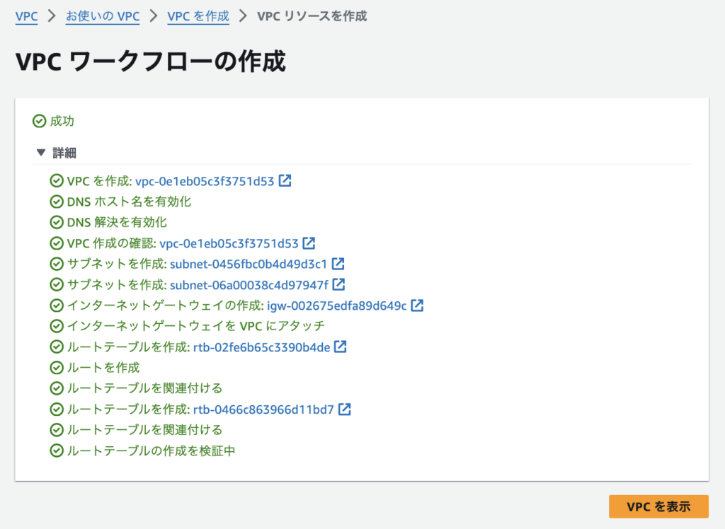 「VPCを作成」以ボタンを実行後、下の結果となればVPCの作成は完了です。