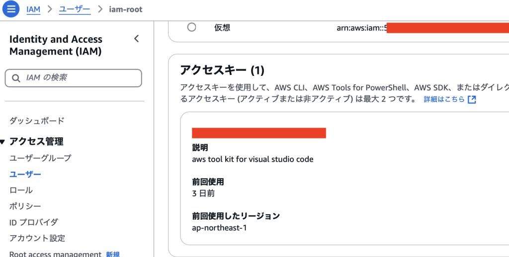 AWS マネジメントコンソールのIAMサービスから確認します。