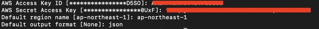 aws configure上記コマンドを実行すると以下の情報の入力を促されるので、順番に入力していきます。