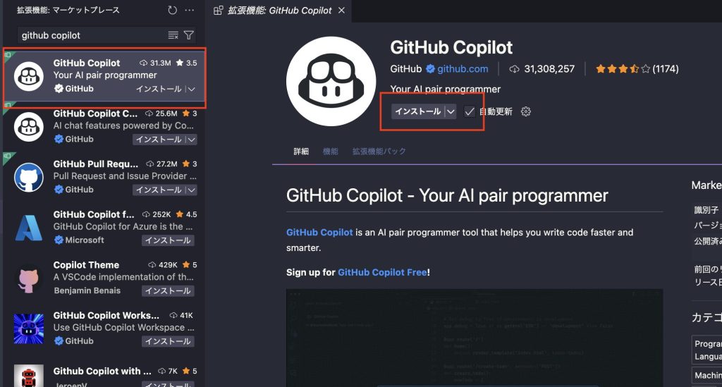 - Step1VSCodeの「GitHub copilot」と入力し インストールをクリック