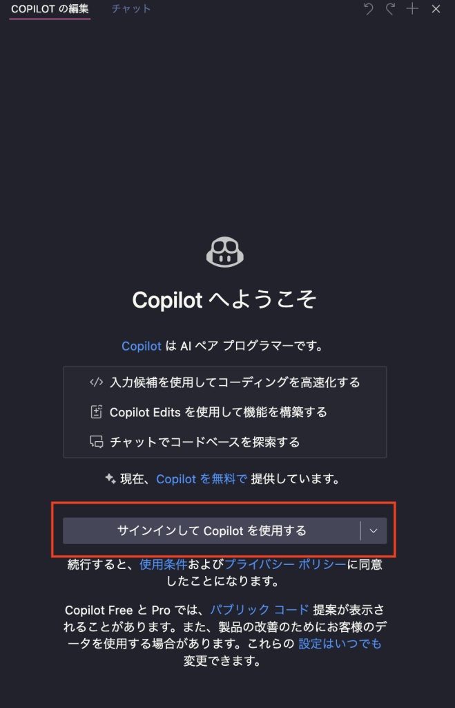 - Step2VSCodeのCopilotの画面で「サインインしてCopilotを使用する」をクリック