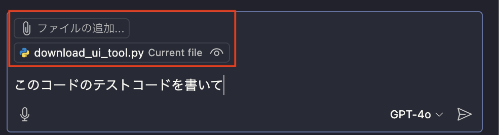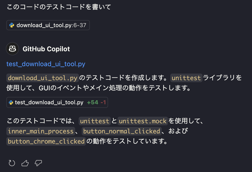 Edgeで利用しているようなチャットがVSCode上で利用できます。また、デフォルトで現在VSCodeで開いているファイルを参照してチャットができます。そのため、プログラミングなどの作業をしている流れで、以下のようにテストコードを作成してもらうことなどが可能です。(もちろん、VSCodeで開いているのとは別のファイルに対しても可能です。)