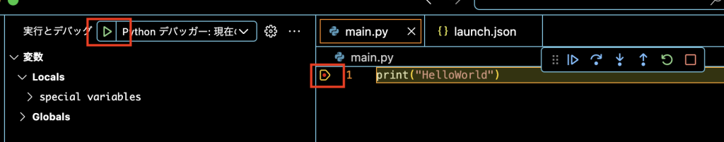 launch.json作成後、ブレークポイントを設定し、実行ボタンをクリックします。