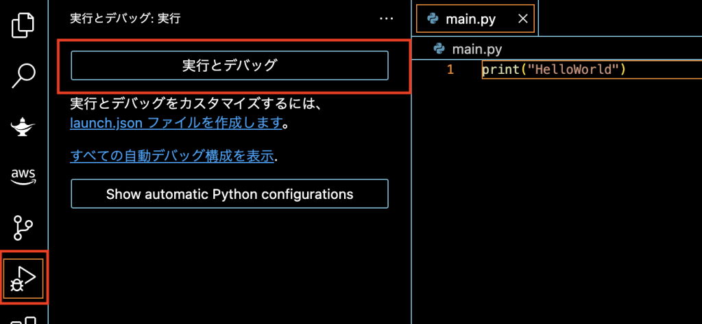 print("Hello-World)VSCodeの「実行」アイコンをクリックし、「実行とデバッグ」をクリックします。